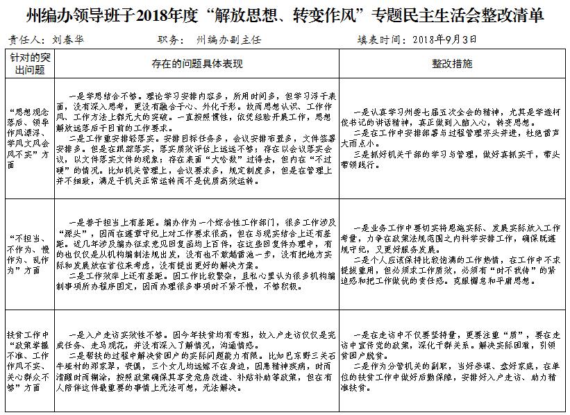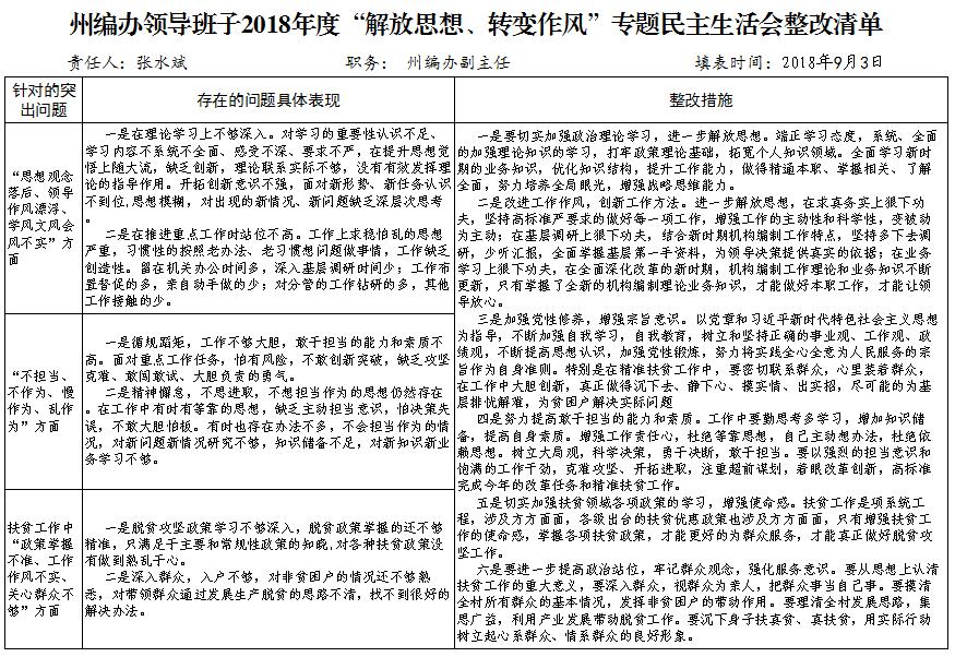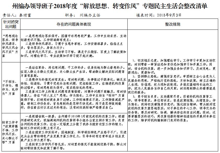 附件:州编办领导班子2018年度“解放思想、转变作风”专题民主生活会整改清单