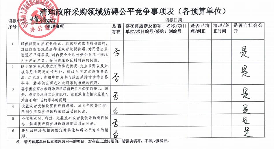 清理政府采购领域妨碍公平竞争事项表