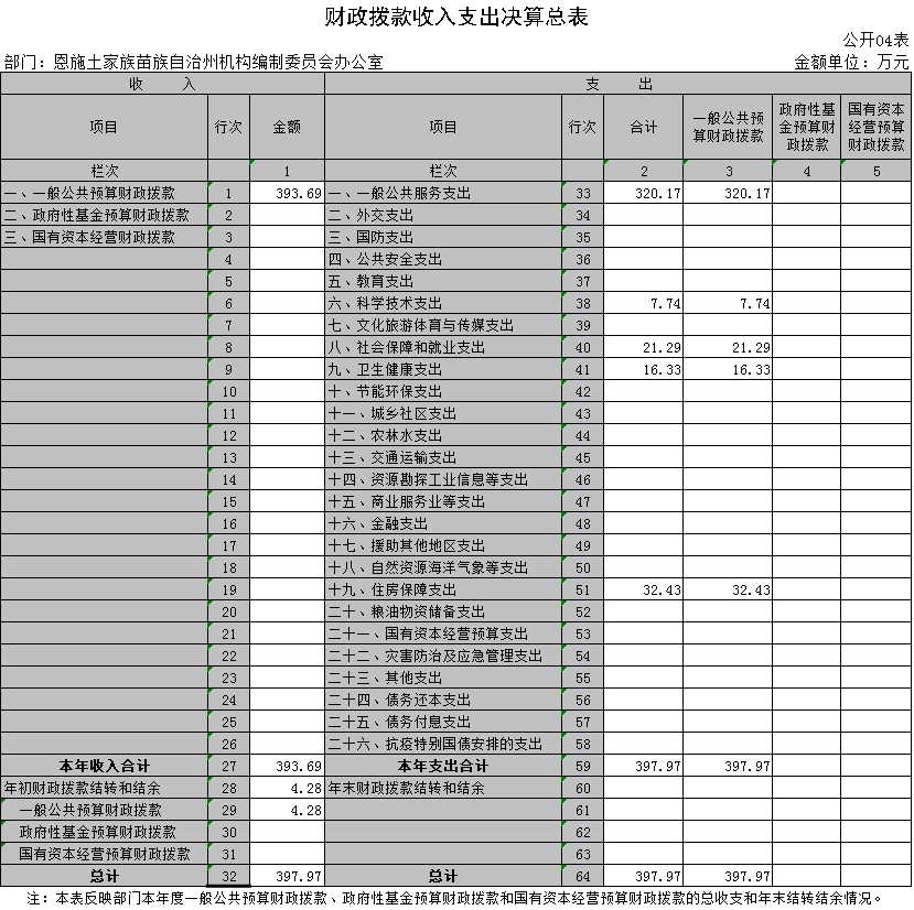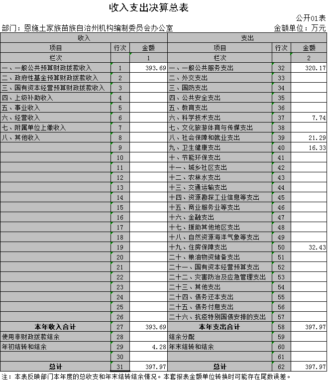 2020年度收入总计397.97万元(其中:财政拨款收入393.69万元,年初结转和结余4.28万元);支出总计397.97万元(其中:财政拨款支出397.97万元)。2019年度收入总计436.64万元(其中:财政拨款收入435.35万元,年初结转和结余1.28万元);支出总计436.64万元(其中:财政拨款支出431.56万元,年末结转和结余5.07万元)。