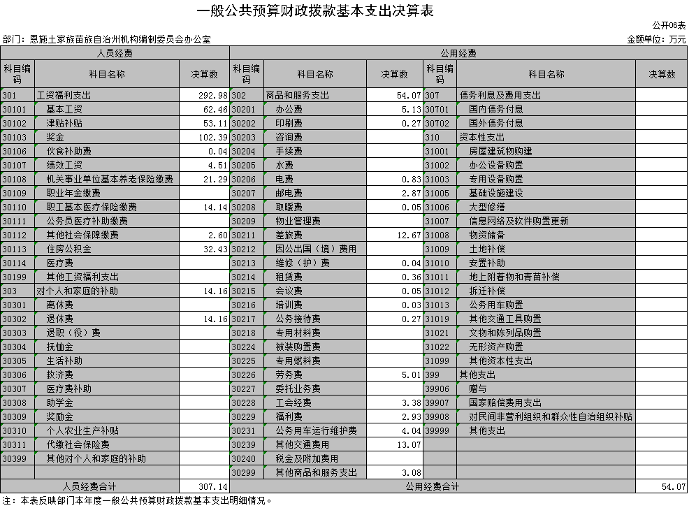 1、人员经费支出307.14万元,为工资福利支出292.98万元(其中:基本工资62.46万元、津贴补贴53.11万元、奖金102.39万元、伙食补助费0.04万元、 绩效工资4.51万元、机关事业单位基本养老保险缴费21.29万元、职工基本医疗保险缴费14.14万元、其他社会保障缴费2.6万元、住房公积金32.43万元)和对个人和家庭补助14.16万元(退休费14.16万元);