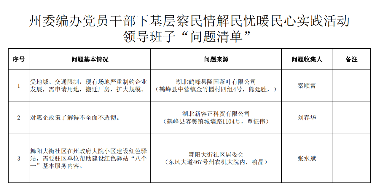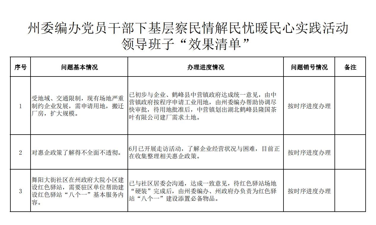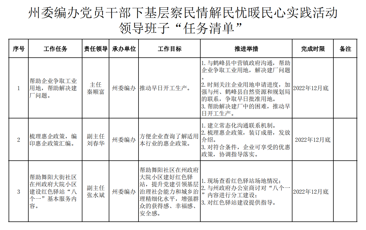 州委编办党员干部下基层察民情解民忧暖民心实践活动领导班子“问题清单”、“任务清单”、“效果清单”