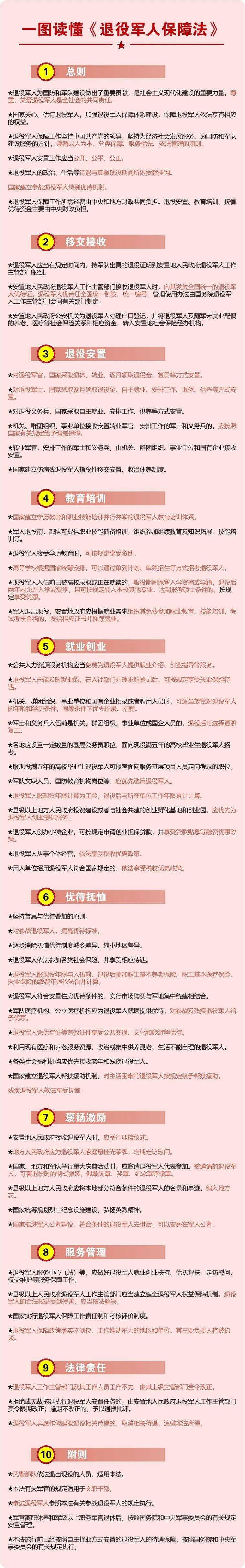 ● 导读 为贯彻实施全州“八五”普法规划,增强法治宣传的针对性和实效性,恩施州创新开展“一月一主题”滴灌式普法,实现从“大水漫灌”到“精准滴灌”普法模式的转变,全面营造办事依法、遇事找法、解决问题用法、化解矛盾靠法的良好氛围。 7 月 宣传主题:“退役军人权益保障” 宣传重点:《中华人民共和国退役军人保障法》 宣传标语:加强退役军人保障工作,维护退役军人合法权益 点击下方链接可查看、下载原片: http://www.mva.gov.cn/sy/shipin/202201/t20220107_55060.html 宣传挂图 一图读懂