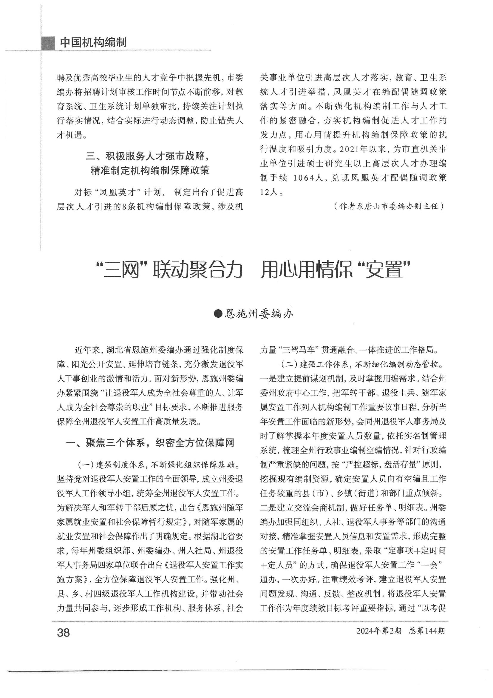 近日,《中国机构编制》杂志第二期刊发恩施州委编办文章《“三网”联动聚合力 用心用情保“安置”》,宣传推介州委编办面对新形势,积极为退役军人安置工作做好服务保障的具体举措。