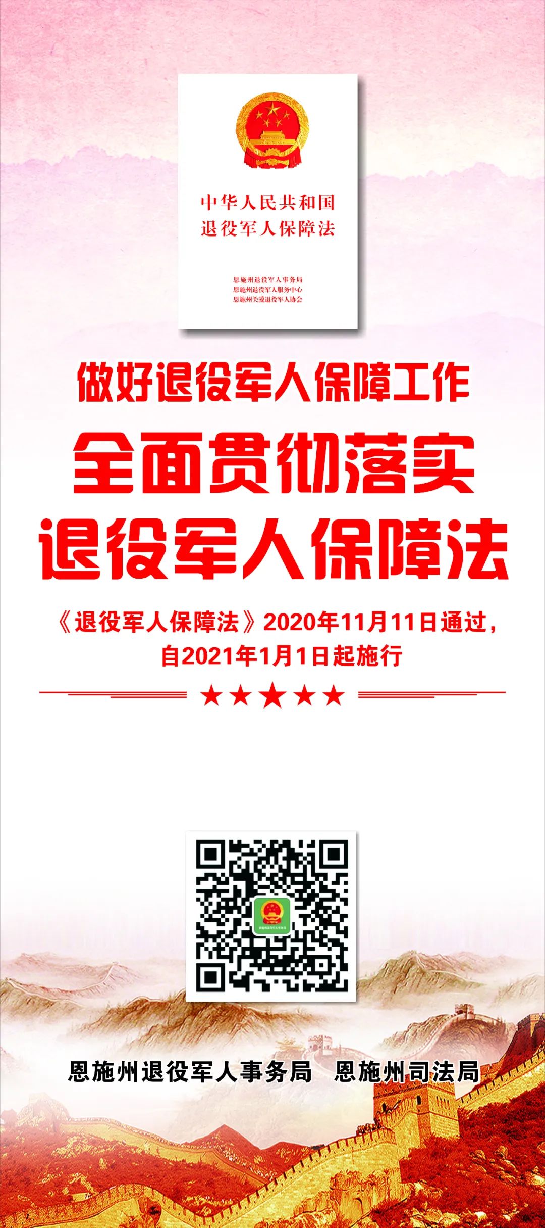 ● 导读 为贯彻实施全州“八五”普法规划,增强法治宣传的针对性和实效性,恩施州创新开展“一月一主题”滴灌式普法,实现从“大水漫灌”到“精准滴灌”普法模式的转变,全面营造办事依法、遇事找法、解决问题用法、化解矛盾靠法的良好氛围。 7 月 宣传主题:“退役军人权益保障” 宣传重点:《中华人民共和国退役军人保障法》 宣传标语:加强退役军人保障工作,维护退役军人合法权益 点击下方链接可查看、下载原片: http://www.mva.gov.cn/sy/shipin/202201/t20220107_55060.html 宣传挂图 一图读懂