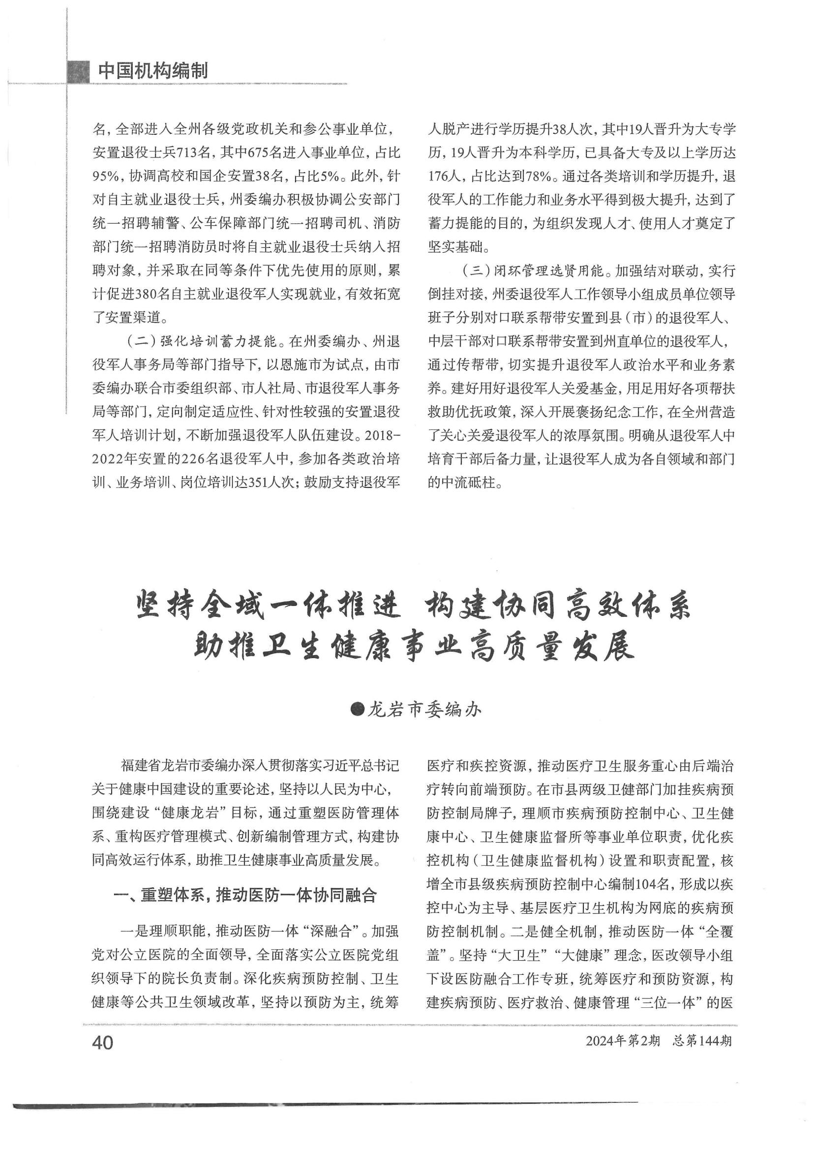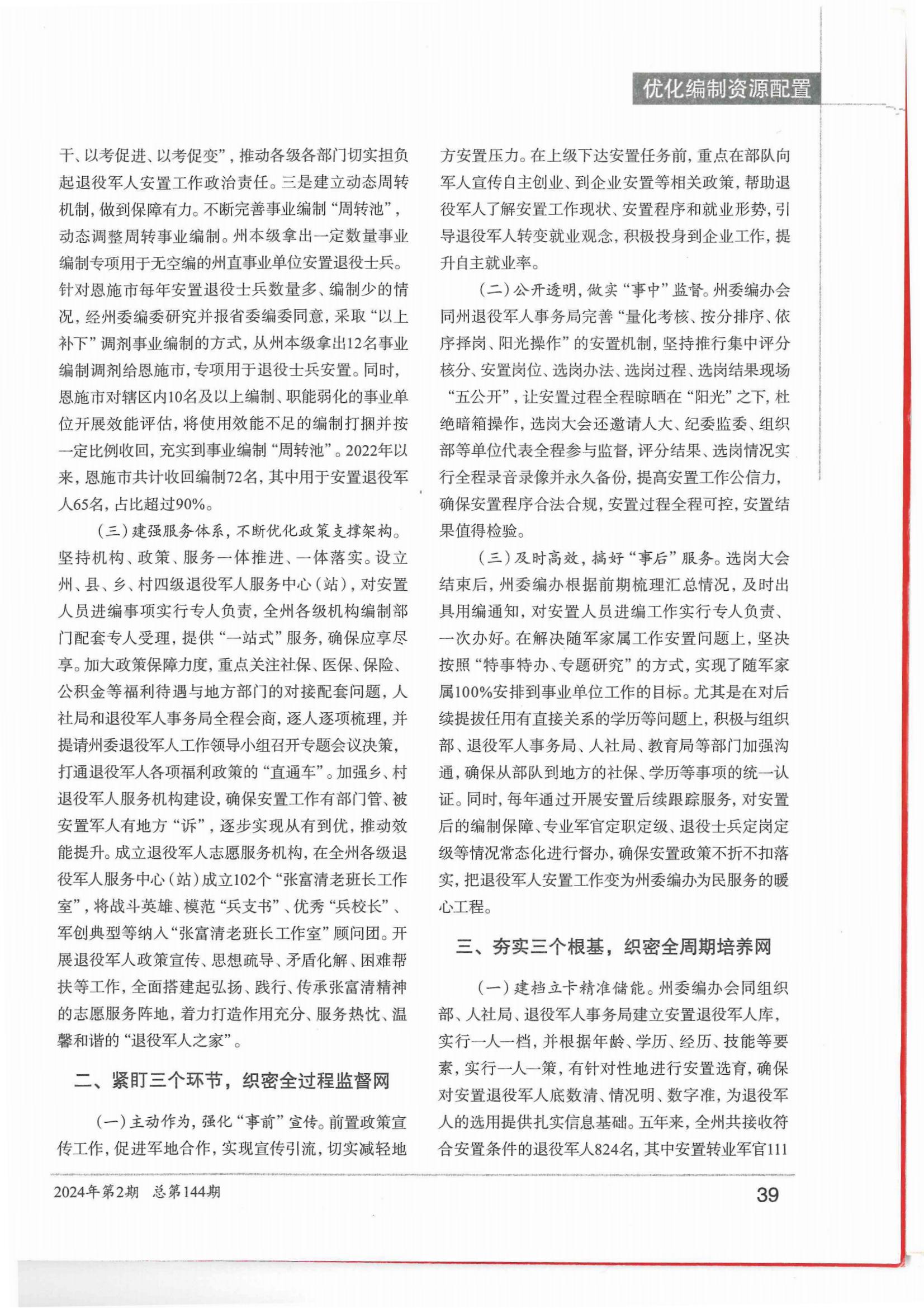 近日,《中国机构编制》杂志第二期刊发恩施州委编办文章《“三网”联动聚合力 用心用情保“安置”》,宣传推介州委编办面对新形势,积极为退役军人安置工作做好服务保障的具体举措。