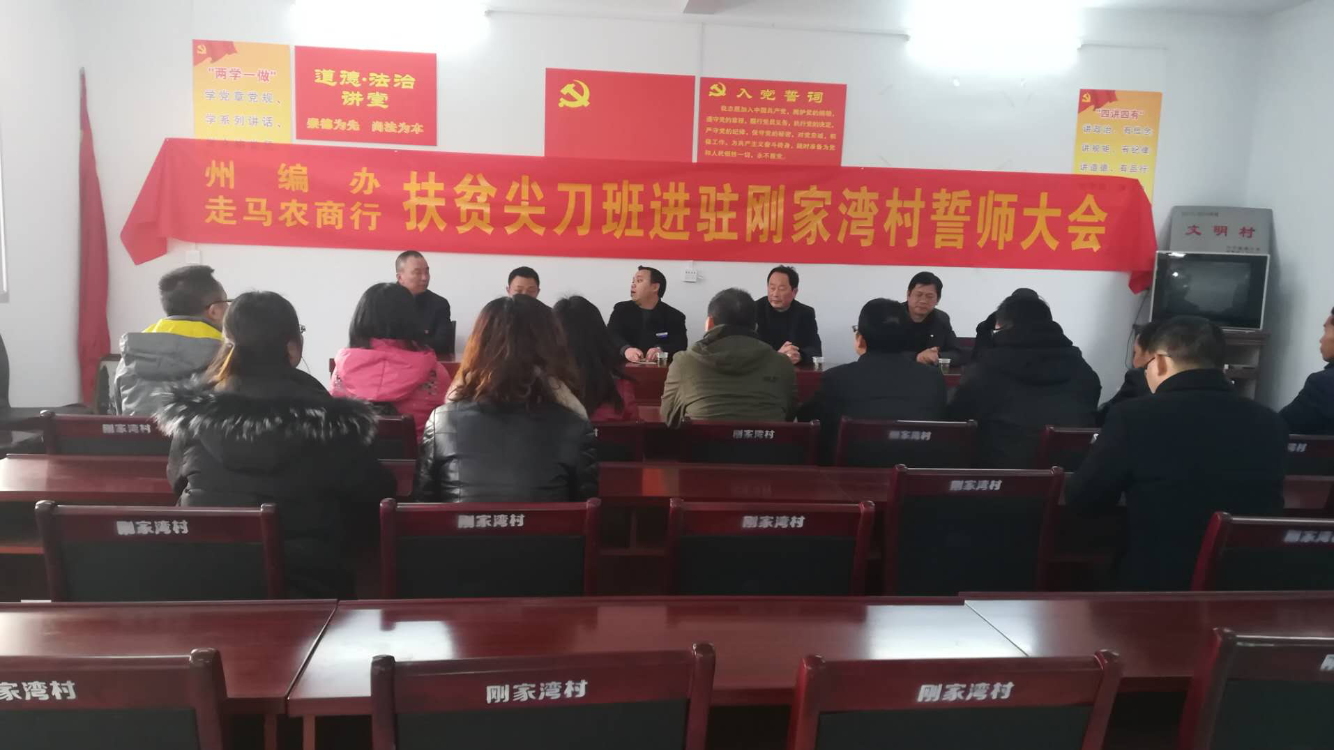 为确保对口帮扶村2018年整村脱贫出列,州编办组织全体干部职工学习全州脱贫攻坚大会精神及《恩施州2018年脱贫攻坚作战方案》,安排精锐力量,明确州编办主任为队长,1名副主任、2名工作人员为脱贫攻坚“尖刀班”成员。在刚家湾村调研时,州编办与村干部和驻村工作队员就当前脱贫攻坚工作进行了座谈,并就2018年工作进行了初步安排。州编办要求全体“尖刀班”成员要始终把脱贫攻坚摆在首要位置,强化责任,聚焦问题,细化措施,精准发力,确保圆满完成刚家湾村2018年脱贫出列任务。